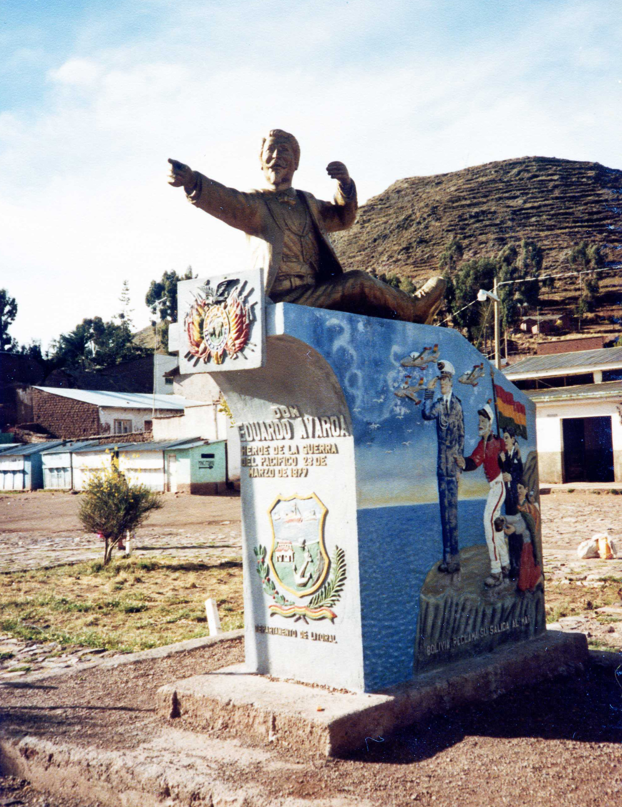 四 季 雑 感 (12) 樫村 慶一 チリの鉱山崩落事故にまつわる裏話し (その2) +++さて本題の太平洋戦争とは+++ 1860年代にスエーデン人のノーベルがダイナマイトを発明し世界的に硝石の需要が高まった。当時、ボリビアとペルーの領土だった南米の太平洋岸地域一帯からは大量の硝石が産出されており、ボリビア経済の根幹を支える貴重な資源になっていた。チリ人が英国と共謀してこの利益に目をつけたのである。すでに1870年代の終わり頃には、この地方には鉱物資源の採掘権をボリビア政府から譲渡されたチリ人や英国人が多数進出していた。ボリビアの太平洋岸と本国の中枢とは、真ん中に6000米を越えるアンデス山脈が聳えていて十分な行き来ができず、通信手段も人馬が頼りであったため、首都ラ・パスと海岸地方の間の情報伝達はきわめて不自由であった。そのため政府の監督の目が十分に届かなかった。採掘権だけでは飽き足りぬチリはこれにつけこみ、英国と組んでこの地方を武力によって自国領土にしようとの野望を抱いた。その手段として、ボリビア政府と協定した税金を意図的に滞納したりして、ボリビア政府を挑発したのである。不安を感じたボリビアとペルー両国は、チリに対抗する同盟条約 を結んだ。1879年の初めに、ラ・パスから海岸地方の地質調査に来た鉱山技術者が、チリ人の横暴な進出を見て大統領に報告、政府は初めて事態の緊迫に驚いた。鉱山技師からの報告書が届けられた時、大統領官邸ではパーティーが行なわれており、緊急報告書は翌日まで開かれないままになっていた。それほど、政府は海岸地方の状況に緊張感がなかったのである。しかし、ここから事態は一挙に戦争へと転がり落ちる。 1879年2月、チリがアントファガスタを占領する。挑発に耐え切れなくなったペルーがまづ宣戦を布告し、ここに太平洋戦争が勃発した。十分に準備をしていたチリ軍は、ペルー、ボリビア連合軍を緒戦で簡単に撃破した。しかし、連合軍側も反撃し戦況は一進一退のまま推移した。 一方、チリの有力な政商達は、言葉巧みに、ボリビア政財界や軍隊上層部などに食い入り、ボリビア政府の政策などの秘密情報を入手し、逐一チリ政府に通報するなどのスパイ行為を働いていた。こうして政商達から絶えず最新情報を得て、常に軍備を整えていたチリ軍は、海岸地方の都市を次々に占領していった。そして、援軍として遥々とアンデスを越えてきたボリビア軍と大規模な会戦を行った。ボリビア軍とペルー軍は緊密に連携して戦ったが、1880年5月の戦いで遂に連合軍は大敗を喫してしまった。 勢いに乗るチリ軍は1881年1月、ペルー中央部まで進出し首都リマを占領した。このとき、インカ帝国が支配していたペルーを侵略したスペイン人ピサロのミイラが安置されている大聖堂もチリ軍に蹂躙された。惨敗を喫した両国は、まず1883年にペルーが降伏し、1884年にはボリビアがアルゼンチンに仲裁を頼み、休戦協定を結んだ。こうして戦いは漸く終わった。 (上の写真は、ボリビア兵(左の赤服)がチリ兵をやつけている場面、下の写真を拡大したもの)) +++++ これがのちにボリビアを”南米で最貧国”と言わしめるもとになった、海への出口を失う原因となった太平洋戦争の概略である。天然資源と貿易 港という国を支える2本柱を失ったボリビアは今もって、「黄金の椅子に眠る乞食」 と皮肉られ南米の最貧国に甘んじている所以でもある。ボリビアやパラグアイの貧困な経済のため南米大陸を一つの域内とする関税自由化交渉がまとまらず、ボリビアは現在でも他の国の発展の足を引っ張っている。これだけ見ても、当時の政府の不手際が如何に大きな失政だったかが分かるというものである。チリとボリビアはその後何回か国交断絶と再開が繰り返されてきたが、いずれも根本的な解決を見出せずにきている。1987年4月にはウルグアイのモンテビデオで、海への出口の返還交渉が行われたが、当時のチリのピノチェット大統領は、一片の土地も譲らないと強行姿勢を示した。これに対してボリビア外相が、卑怯者とののしったり、チリ製品のボイコットを決めるなど、両国関係は一触即発の危機状態に陥ったこともあり、今もって不仲は解消されていない。今回の落盤事故のような場合を利用してでも、なんとか交渉の糸口が欲しいボリビアは気の毒と言うほかない。 ボリビアの太平洋への出口への欲求は、日本の北方領土返還の悲願と同じようなものであるが、こちらの方は、国の繁栄が止まって以来、すでに120年以上も訴えつづけているのだ。チリが返還に応じる可能性は殆ど無いだろうから、ボリビアにとっては未来永劫に背負わなければならない宿命であると言える その1で述べた兎の形をしたチチカカ湖(小チチカカと言われる)から、本来のチチカカ湖に渡る渡し 舟の桟橋の横に、コンクリートでできた記念碑が建っている。ボリビアにとって、悔やんでも悔やみきれない、太平洋戦争のモニュメントで